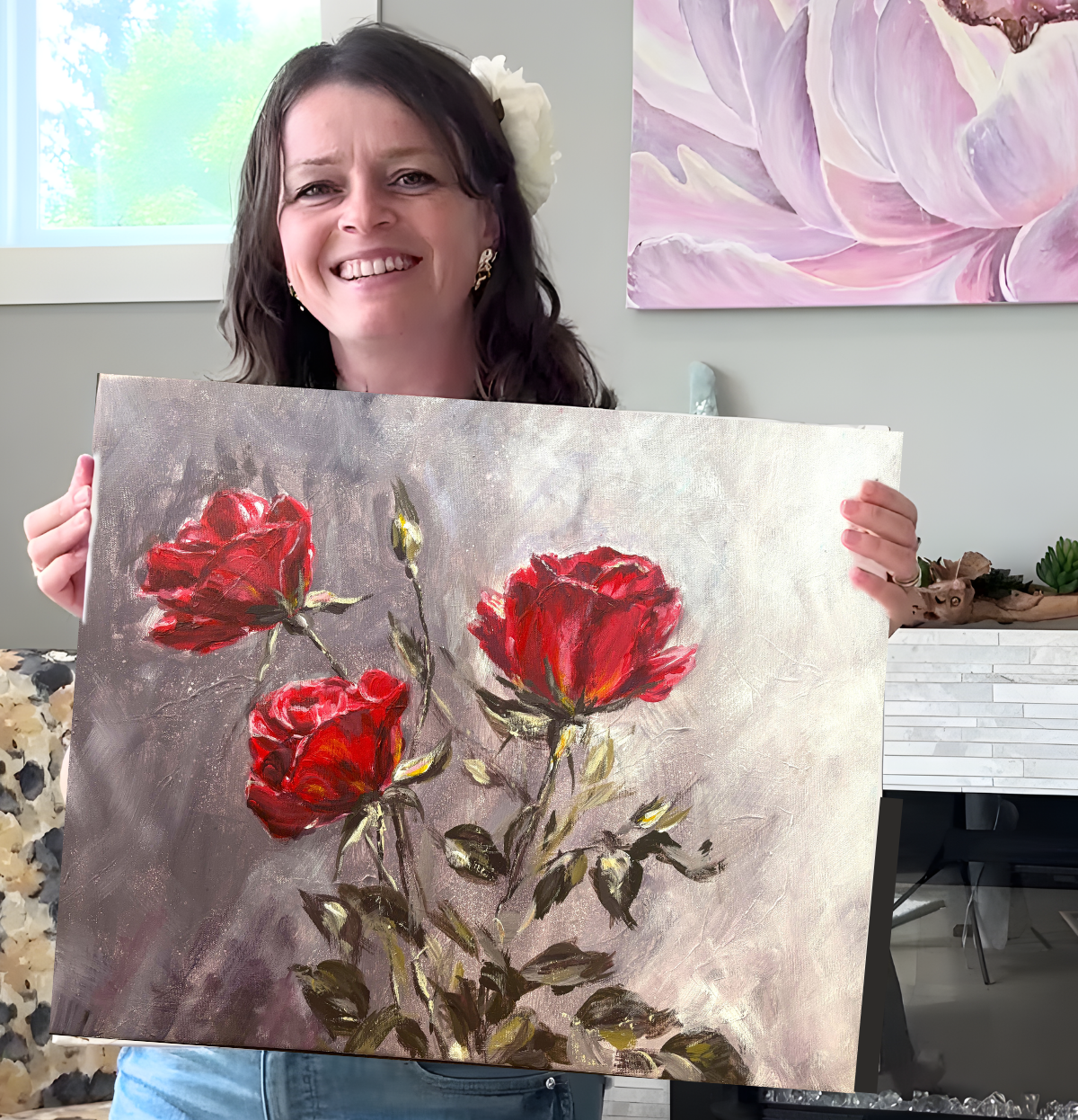 Velvet Resilience portrays deep red roses emerging from a textured, atmospheric background. Rich tones and dramatic contrasts reflect passion, endurance, and inner power softened by elegance. This piece carries a timeless presence—bold yet refined—bringing depth, emotion, and sophistication to any interior.